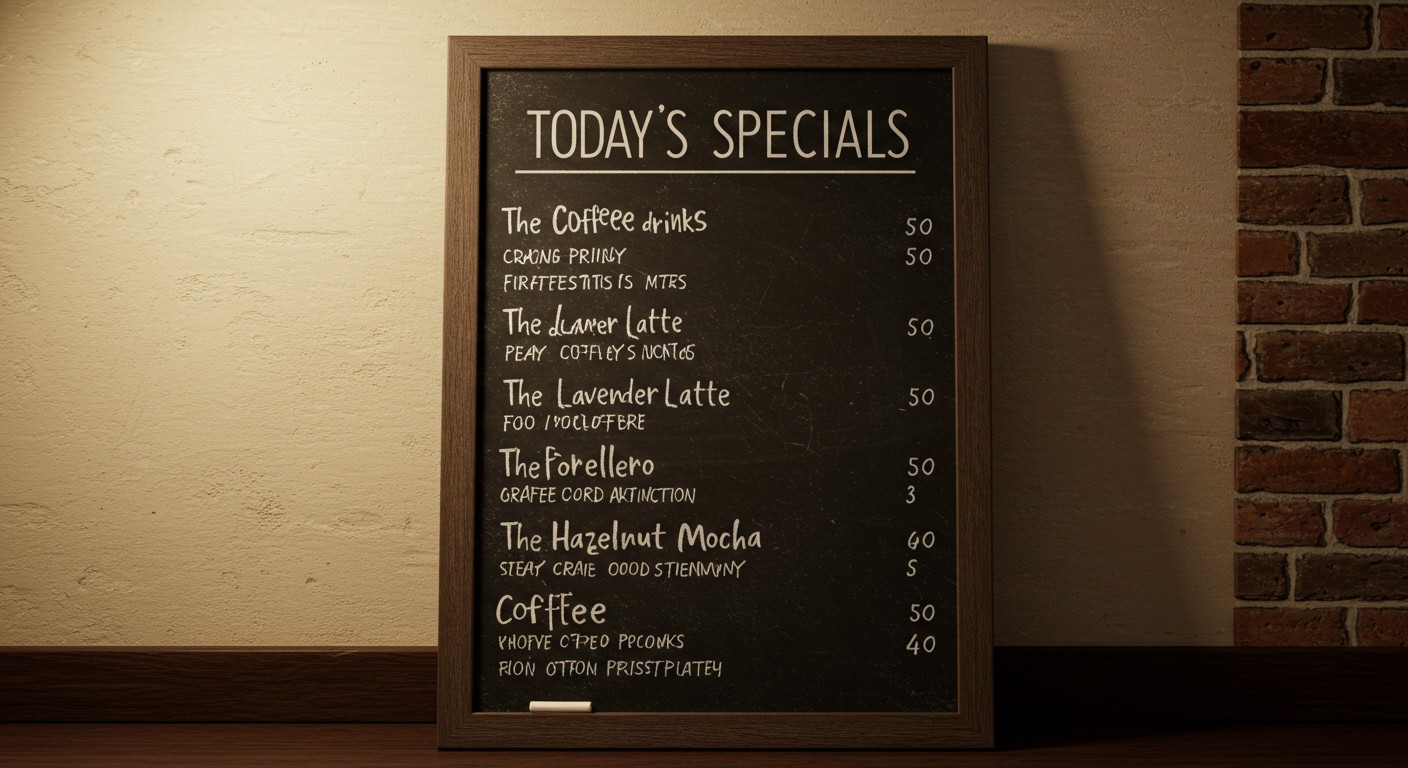 - 프롬프트: "A cafe menu board with the text 'TODAY'S SPECIALS' and a list of coffee drinks"