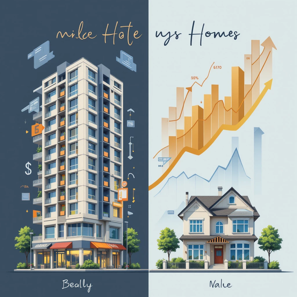 A conceptual financial illustration comparing real estate investment in mixed-use buildings versus single-family homes. One side features a high-rise building with multiple rental units and commercial shops, with financial graphs and profit arrows overlayed. The other side shows a suburban house with a steady value increase over time, represented by a stable financial trend line. Modern and clean data visualization, realistic rendering.
